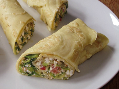 Teig in der Pfanne nacheinander zu vier Wraps ausbacken. Zucchini-Käse-Füllung darauf verteilen und aufrollen.
