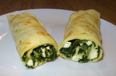 Nun das Mineralwasser unter den Pfannkuchenteig rühren und in einer großen Pfanne mit etwas Öl nacheinander 4 dünne Pfannkuchen ausbacken. Die Feta-Spinat-Füllung auf den Pfannkuchen verteilen und aufrollen.
